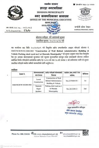बोलपत्र स्वीकृत गर्ने आशयको सूचना !!